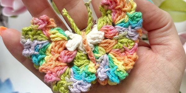 Une main tient un petit papillon coloré au crochet dans des tons pastel, entouré de fleurs artificielles en arrière-plan.
